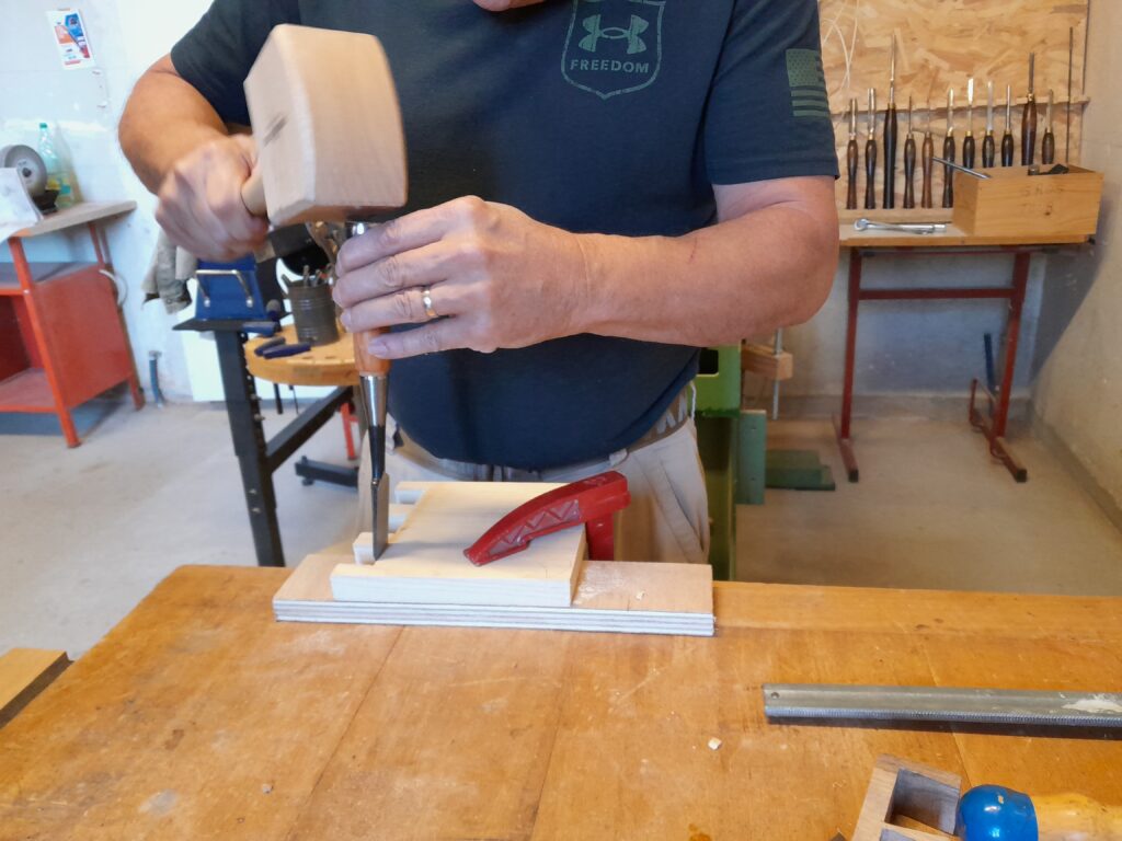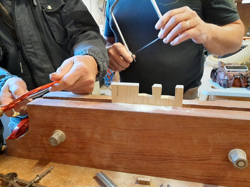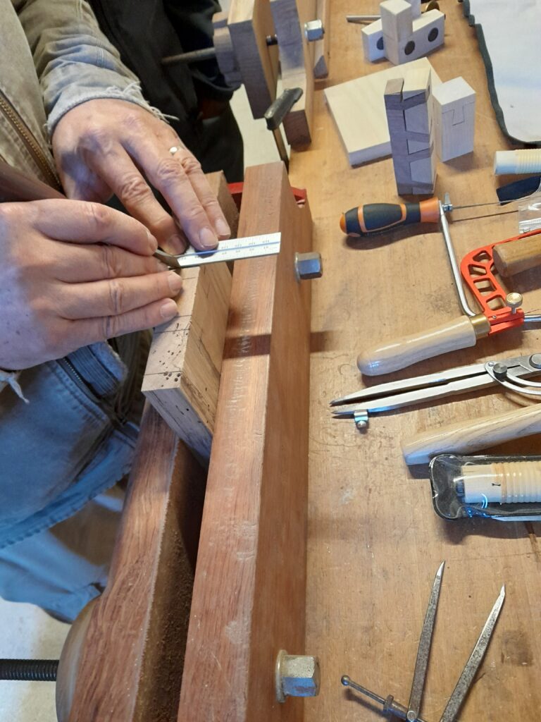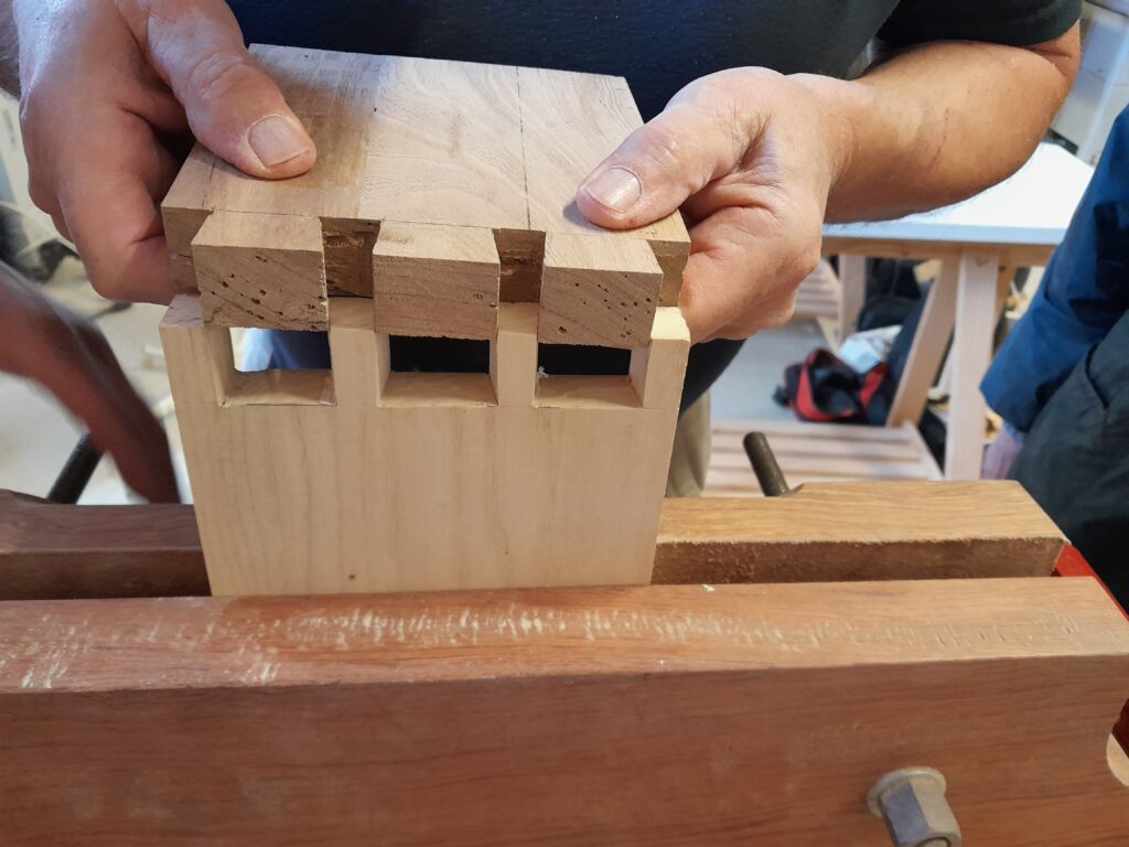 Pas de machines ce samedi d’octobre pour faire des assemblages en queues d’arondes, mais tout le savoir-faire du travail à la main de Daniel G.